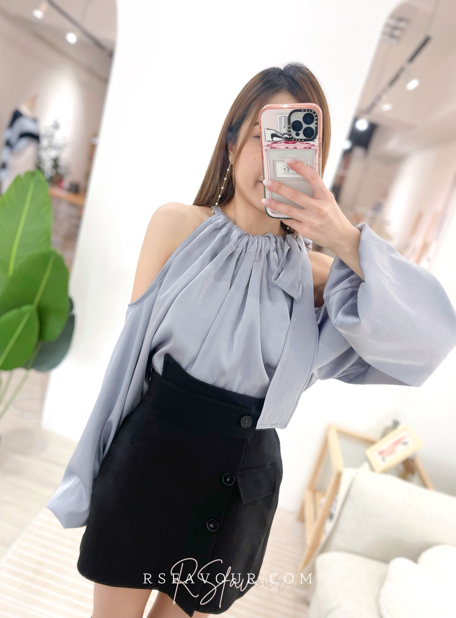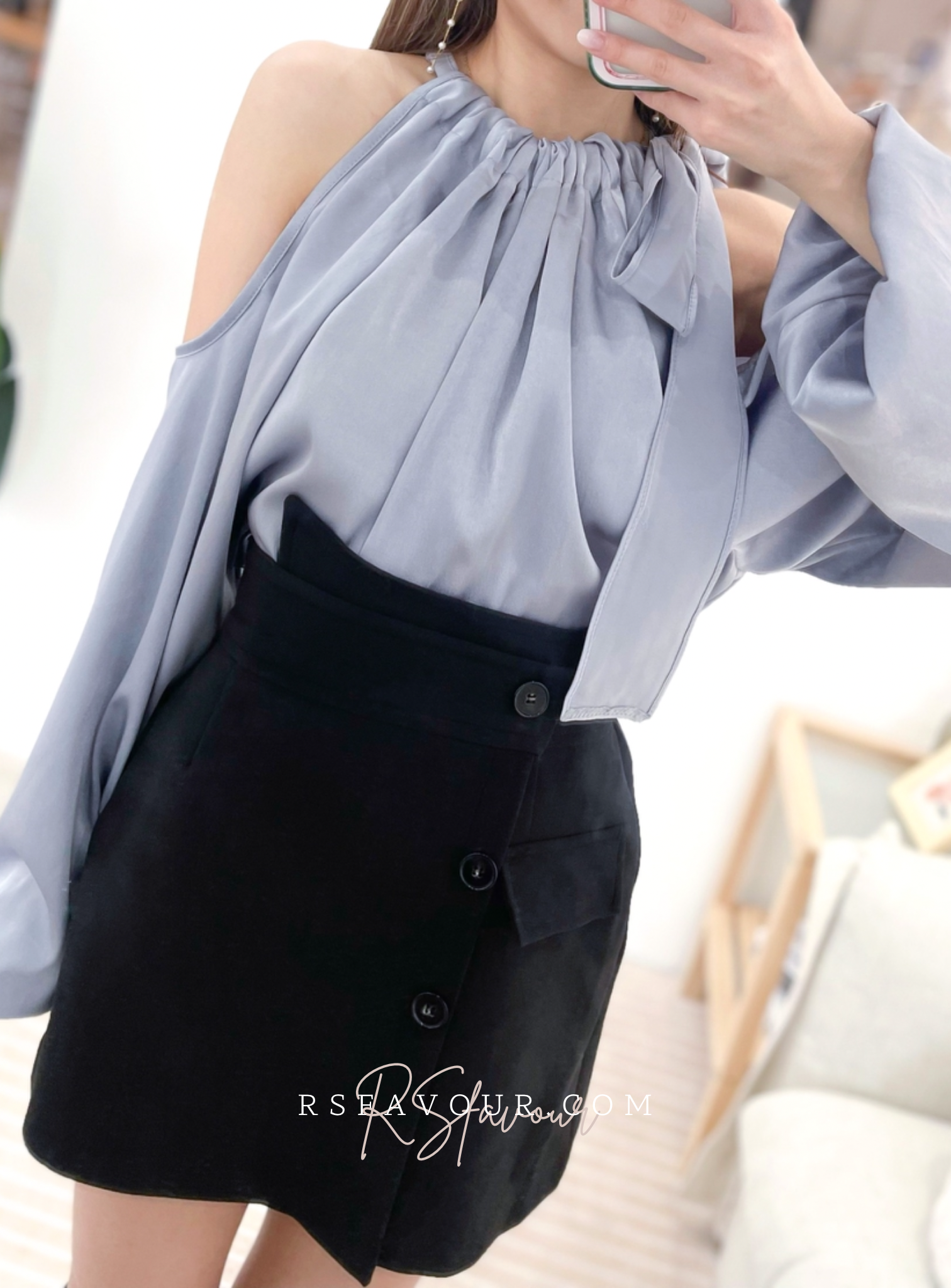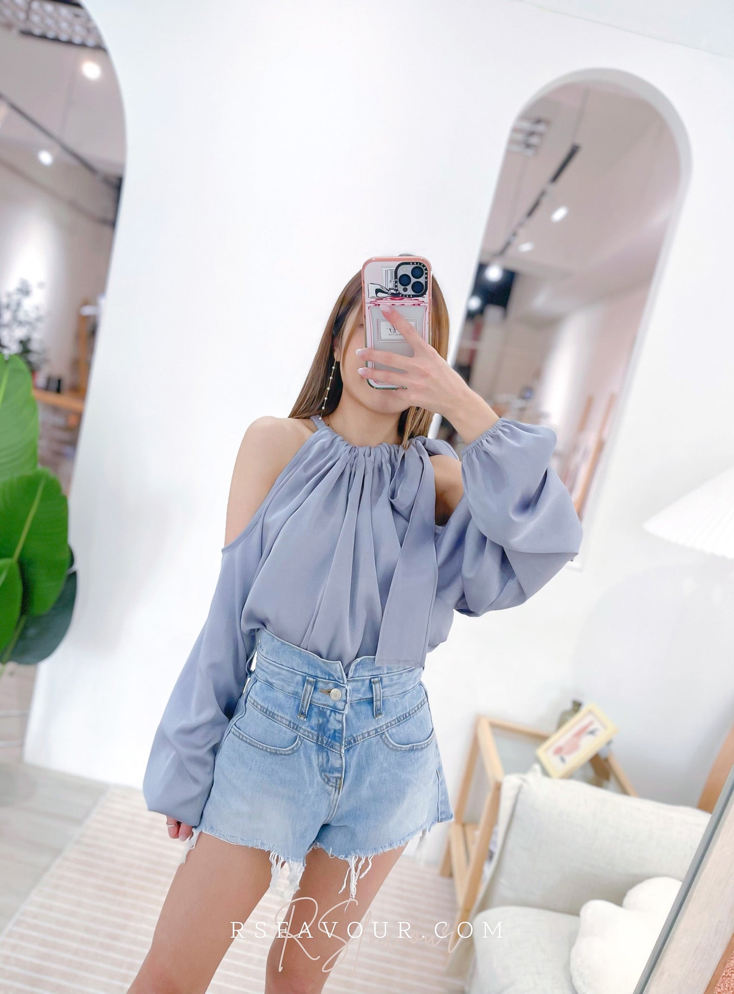 T28 蝴蝶結絲帶露肩上衣( 灰藍 )