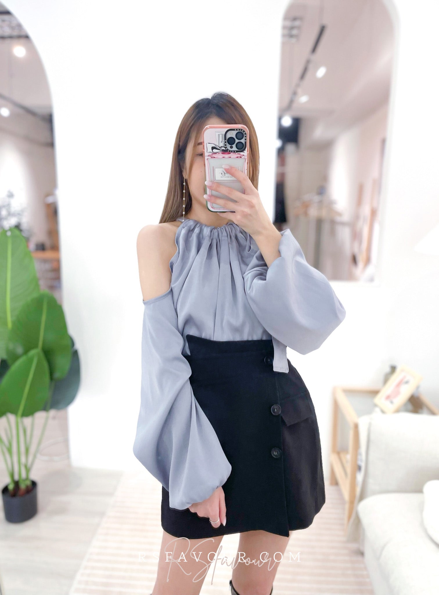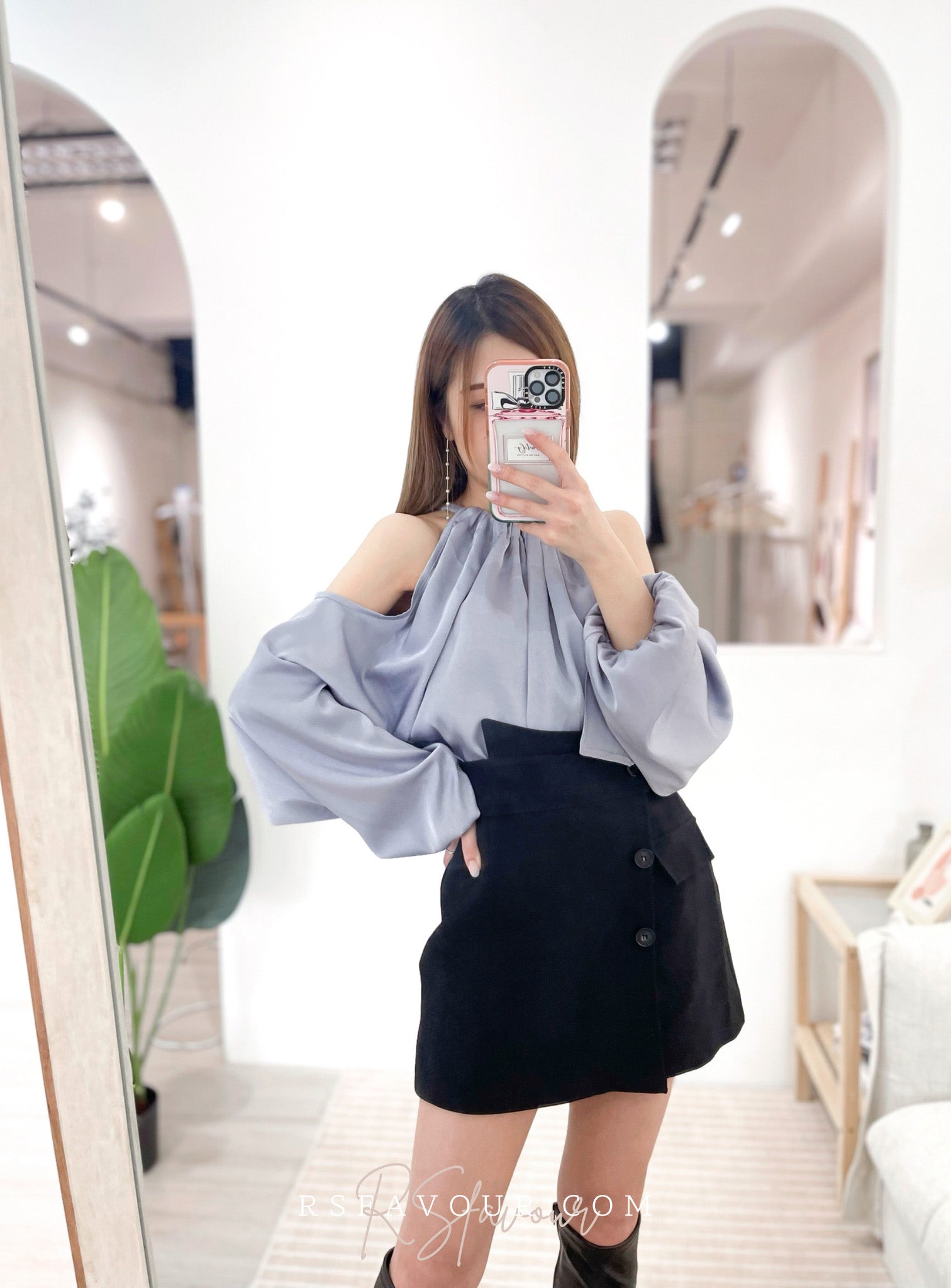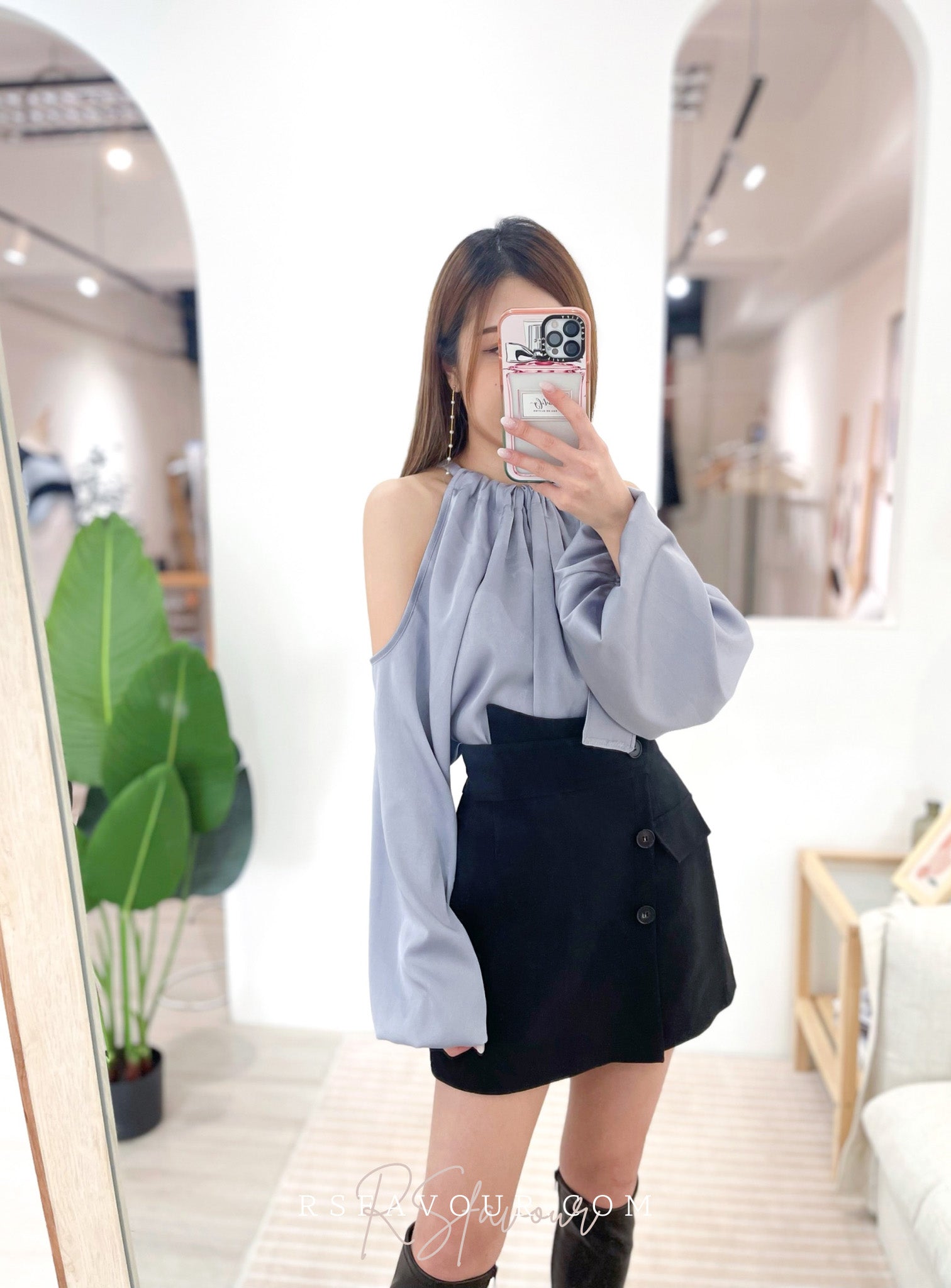 T28 蝴蝶結絲帶露肩上衣( 灰藍 )