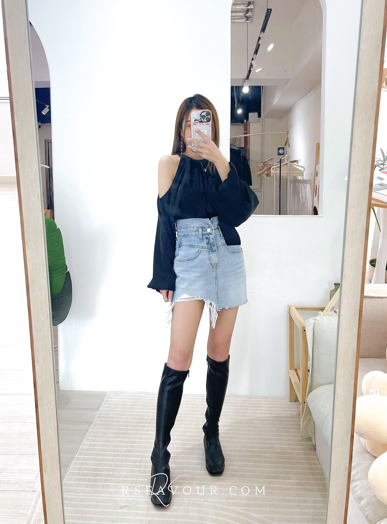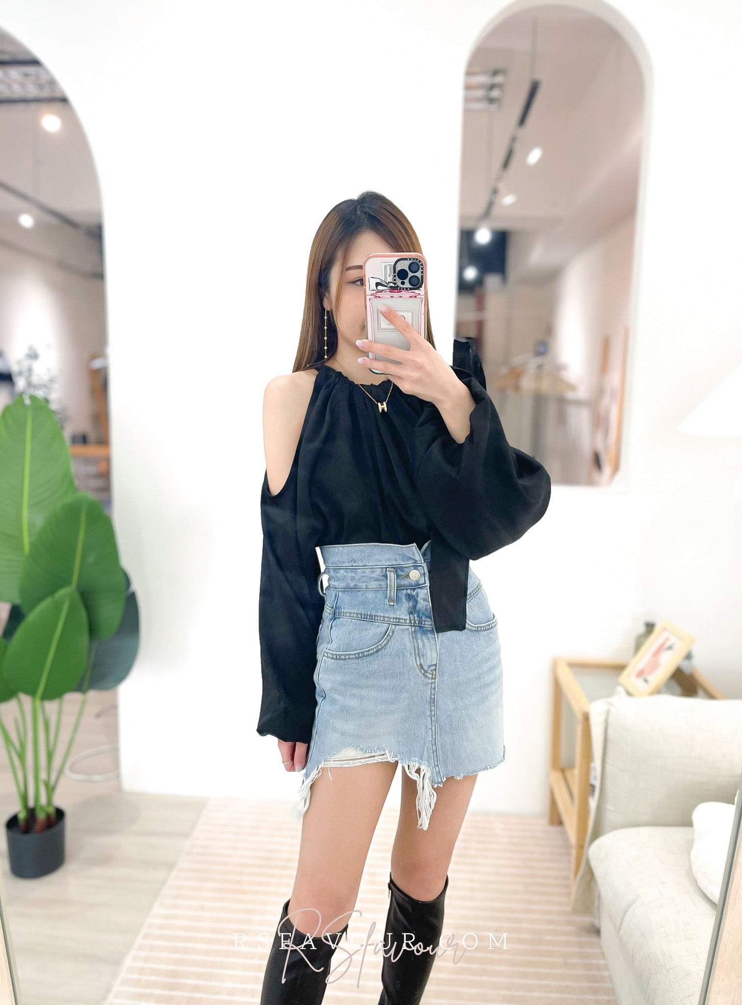 T28 蝴蝶結絲帶露肩上衣( 黑 )