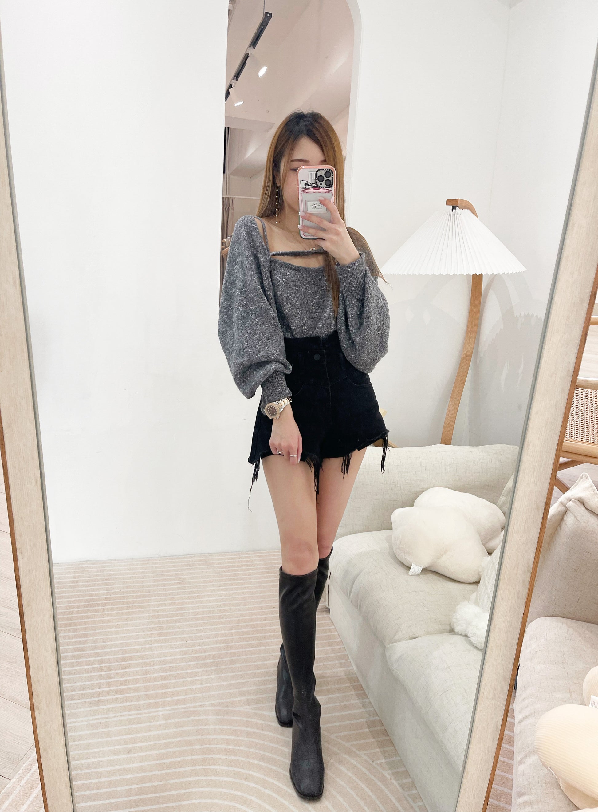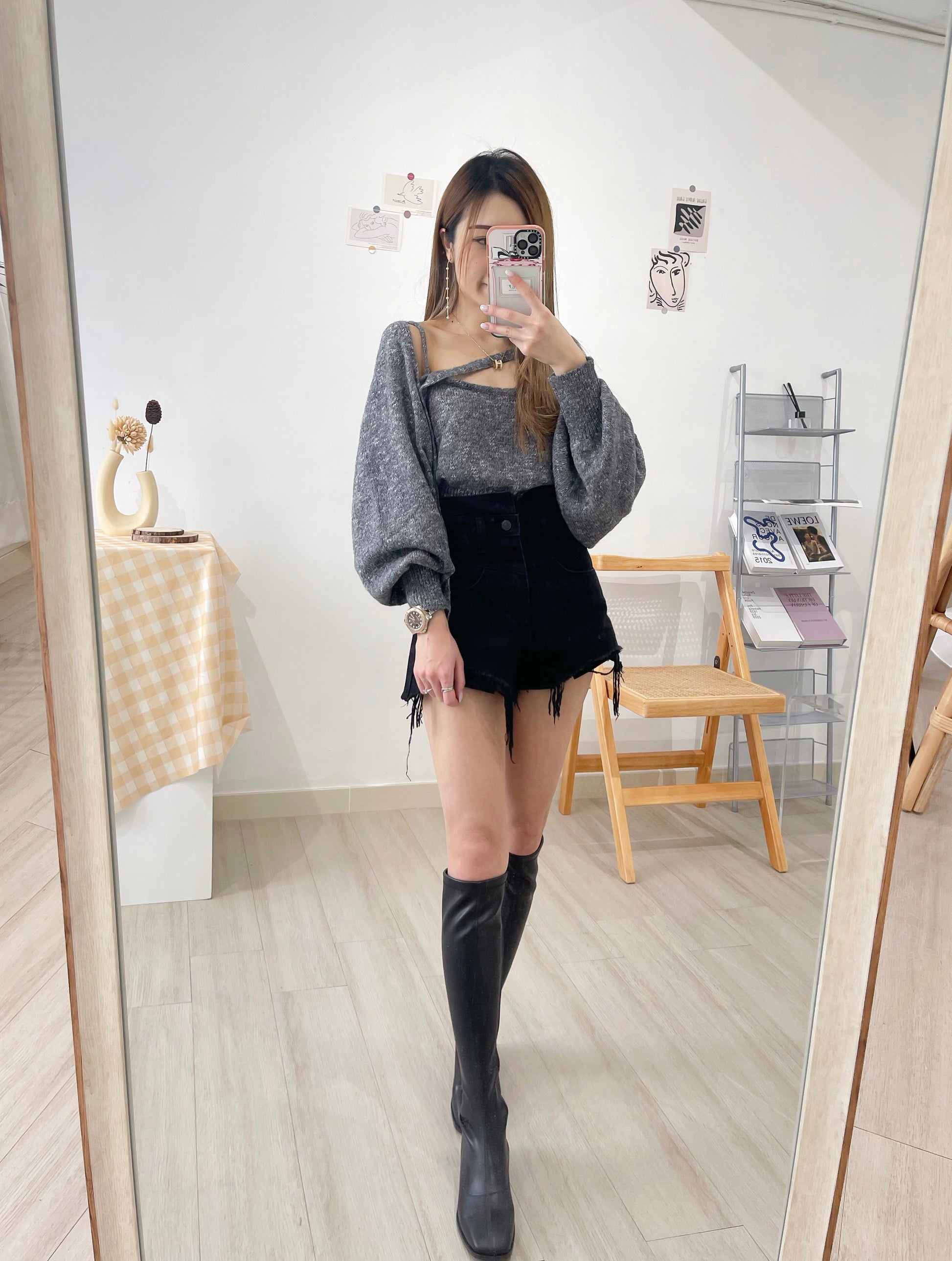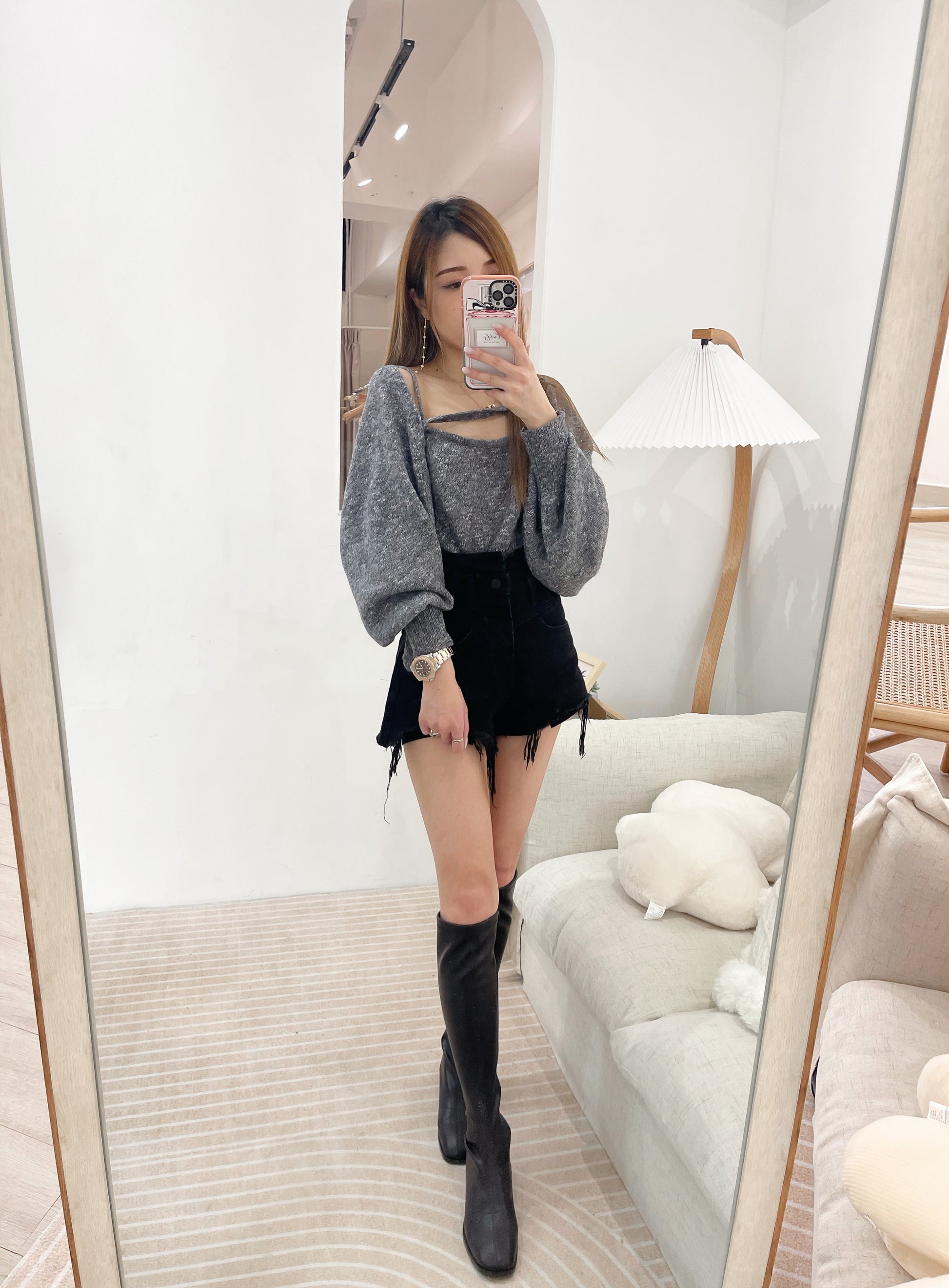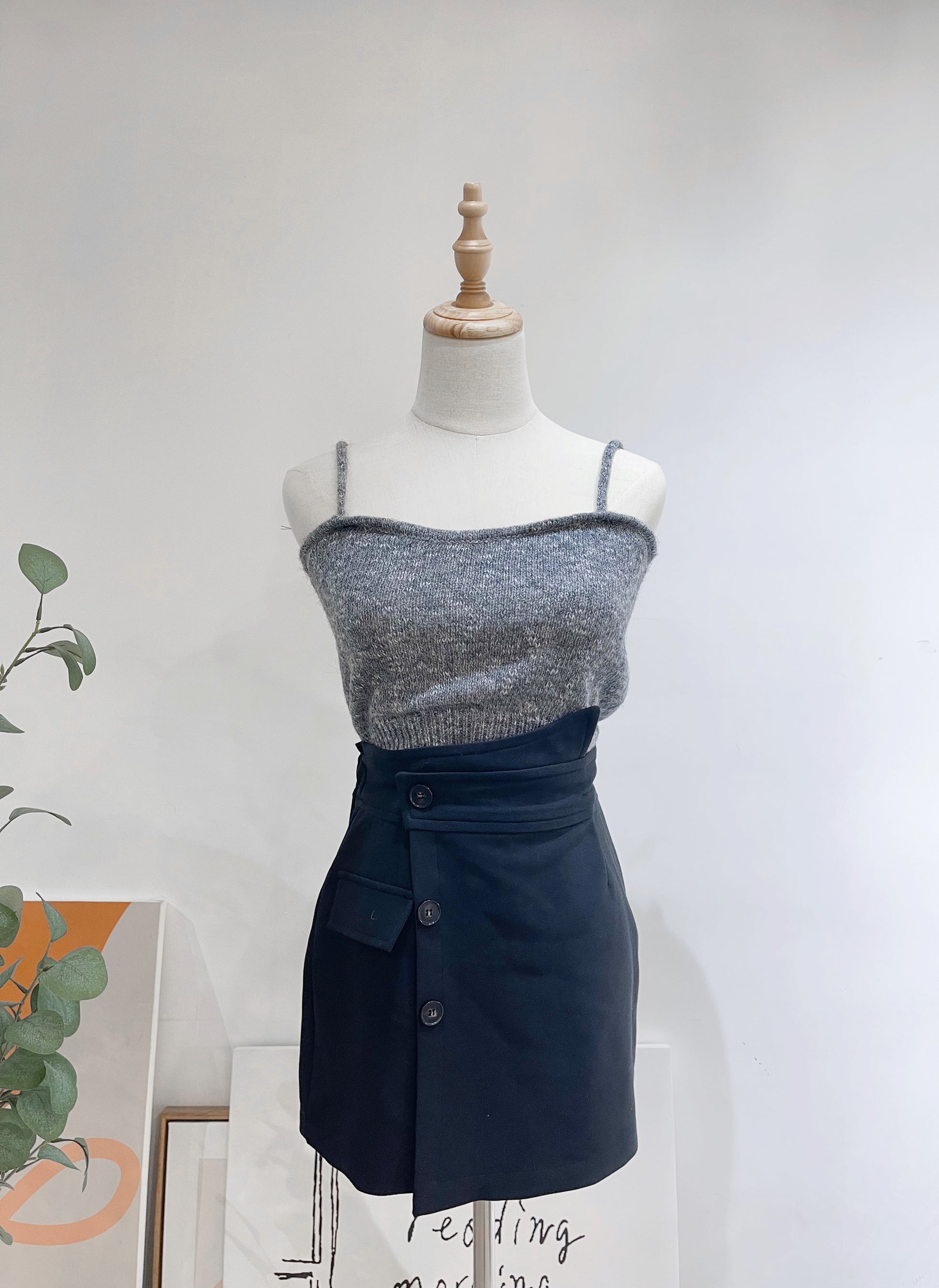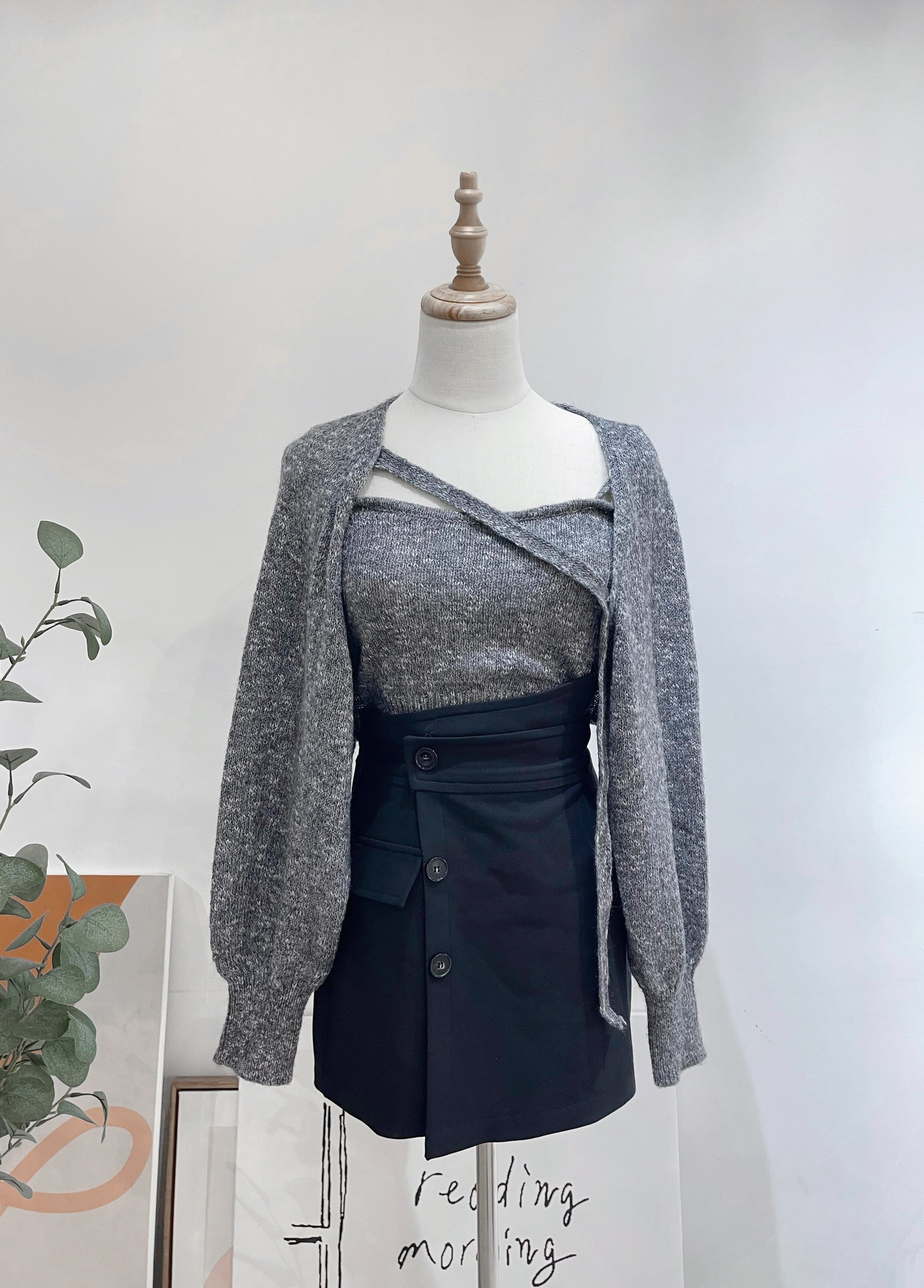 T32 混冷吊帶背心+泡泡袖斜帶JK套裝( 灰 )